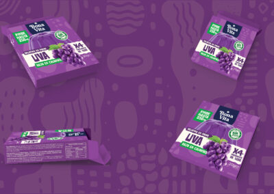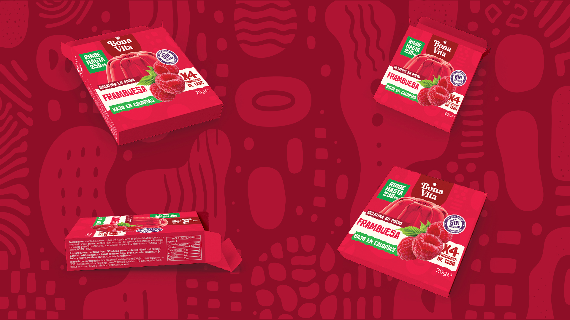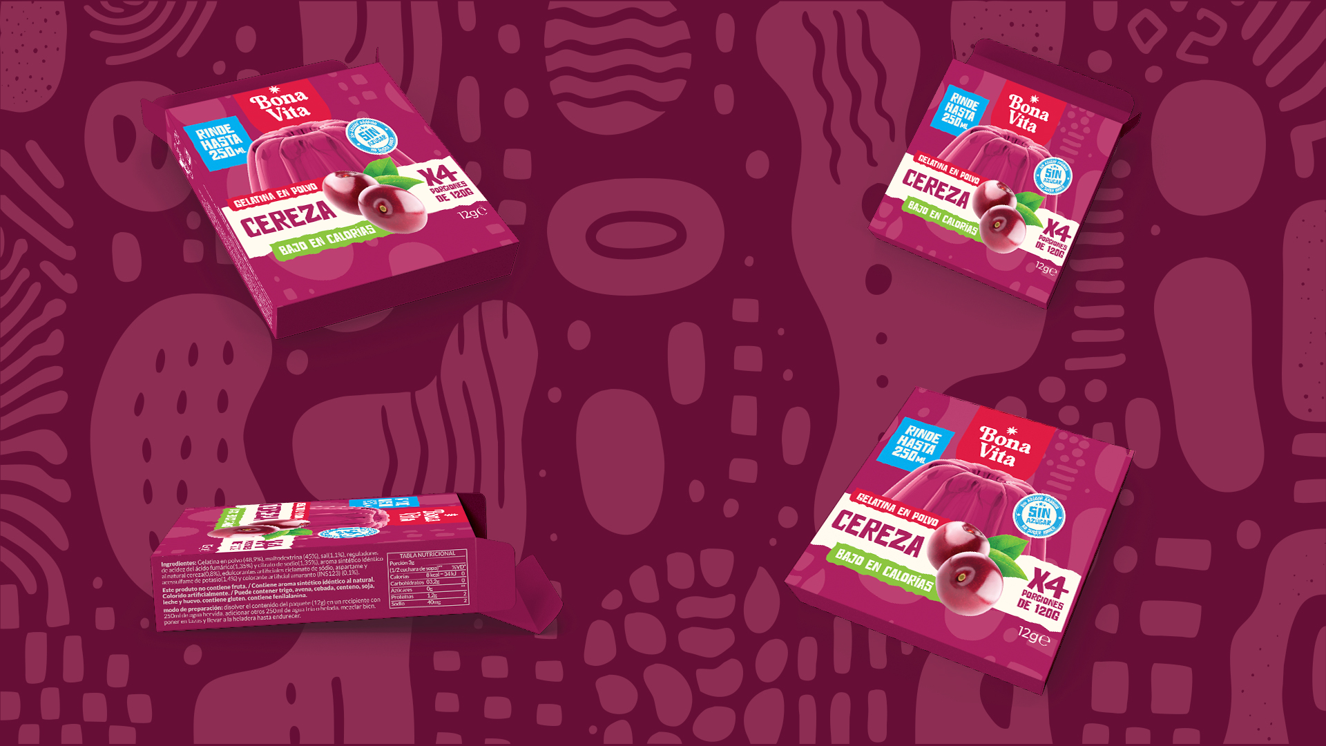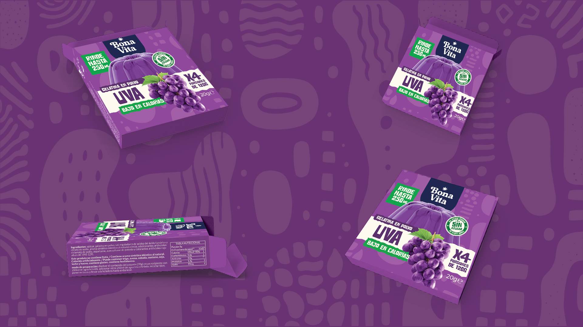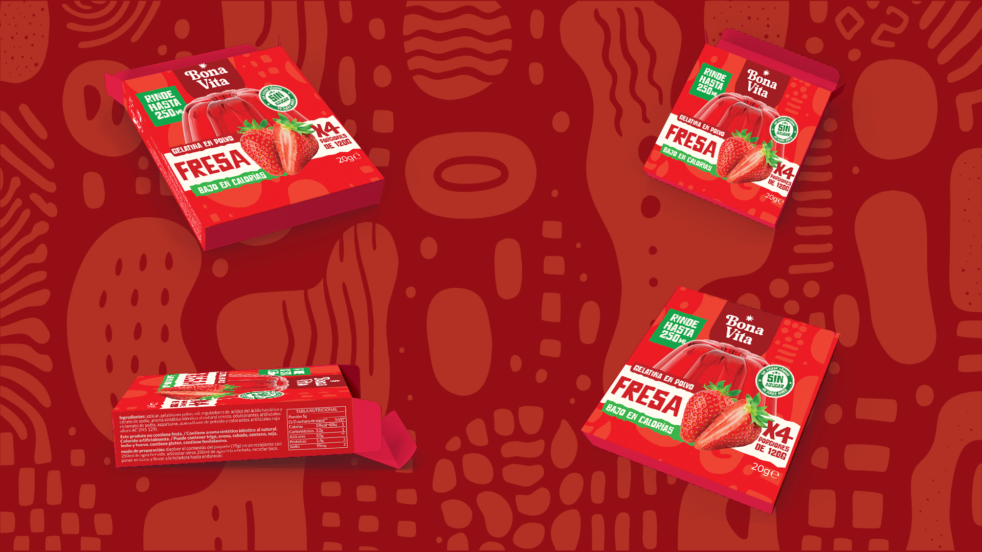 Propuesta gráfica para la línea de gelatinas en polvo de Bounavita, enfocada en transmitir sabor, energía y claridad visual en punto de venta. El reto fue equilibrar una estética vibrante con una estructura informativa clara y accesible.